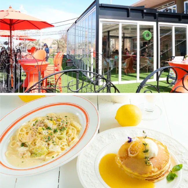 緑が広がる開放的な空間で、絶景のオーシャンビューとともに、ゆったりと落ち着いた時間を過ごせる大人カフェ。ワンちゃん専用エリアもあり、愛犬とカフェタイムをお楽しみいただけます。